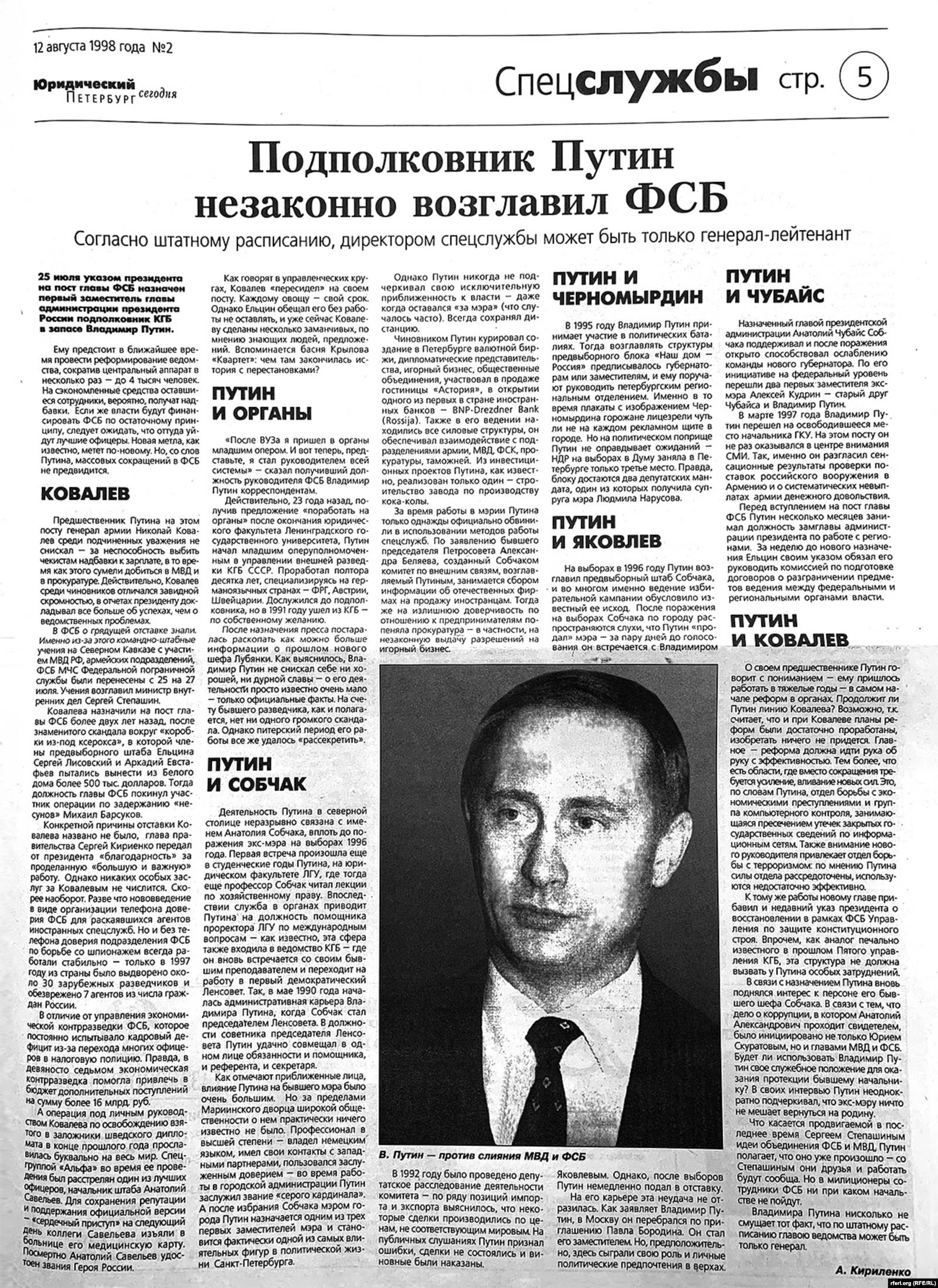 Настоящее Время и Радио Свобода публикуют полный текст статьи "Подполковник Путин незаконно возглавляет ФСБ", которую редакция газеты "Юридический Петербург сегодня" опубликовала 12 августа 1998 года под коллективным псевдонимом "А. Кириленко". Это произошло за неделю до того, как редактор издания Анатолий Левин-Уткин был найден избитым и без сознания у лифта в собственной парадной, а вскоре скончался в больнице.