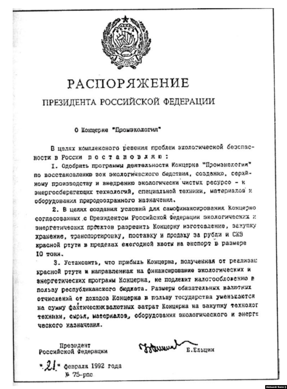 Как утверждает в своей книге Александр Гуров, тогда же Борис Ельцин подписал указ, запрещавший оформление квот и лицензий на экспорт красной ртути (копии документа у Гурова нет).