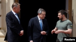 Премьер-министр Италии Марио Драги, президент Франции Эммануэль Макрон и канцлер Германии Олаф Шольц приехали в Украину впервые с начала российского вторжения.