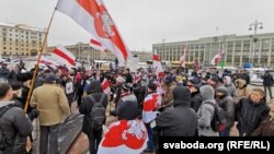 Люди держат в руках бело-красно-белые флаги и плакаты в поддержку арестованных и оштрафованных за предыдущие акции. Один из выступающих на митинге лидер движения "Разам" Вячеслав Сивчик также произносил имена политзаключенных Беларуси и потребовал их освобождения.
