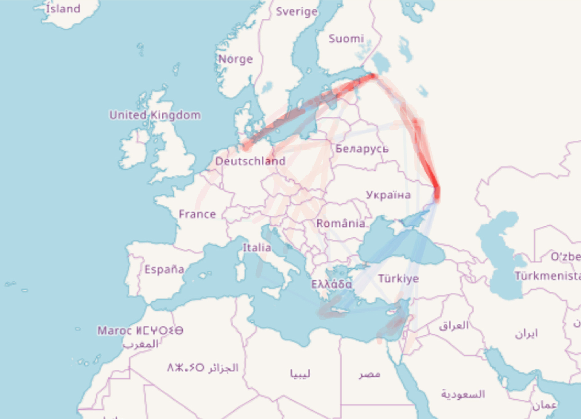 Сравнительная карта авиаперелетов: на первом слайде совмещены 80 треков борта M-VITO, на втором — 40 треков самолета VP-CSP. Каждый трек может включать полет в одну сторону, рейс туда и обратно или даже сложный маршрут с несколькими промежуточными посадками. Как видно, M-VITO чаще использовался для путешествий в Германию, оба самолета множество раз засекались приемниками в районе островов Кипр и Крит, направляясь к побережью Ливана, Ливии и Сирии. Карта: OpenStreetMap
