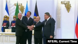 Со стороны оккупированных территорий подписи под договорами поставили "главы" так называемых "ДНР" и "ЛНР" Денис Пушилин и Леонид Пасечник, а также назначенные Россией "главы" Херсонской и Запорожской военно-гражданских администраций Владимир Сальдо и Евгений Балицкий.