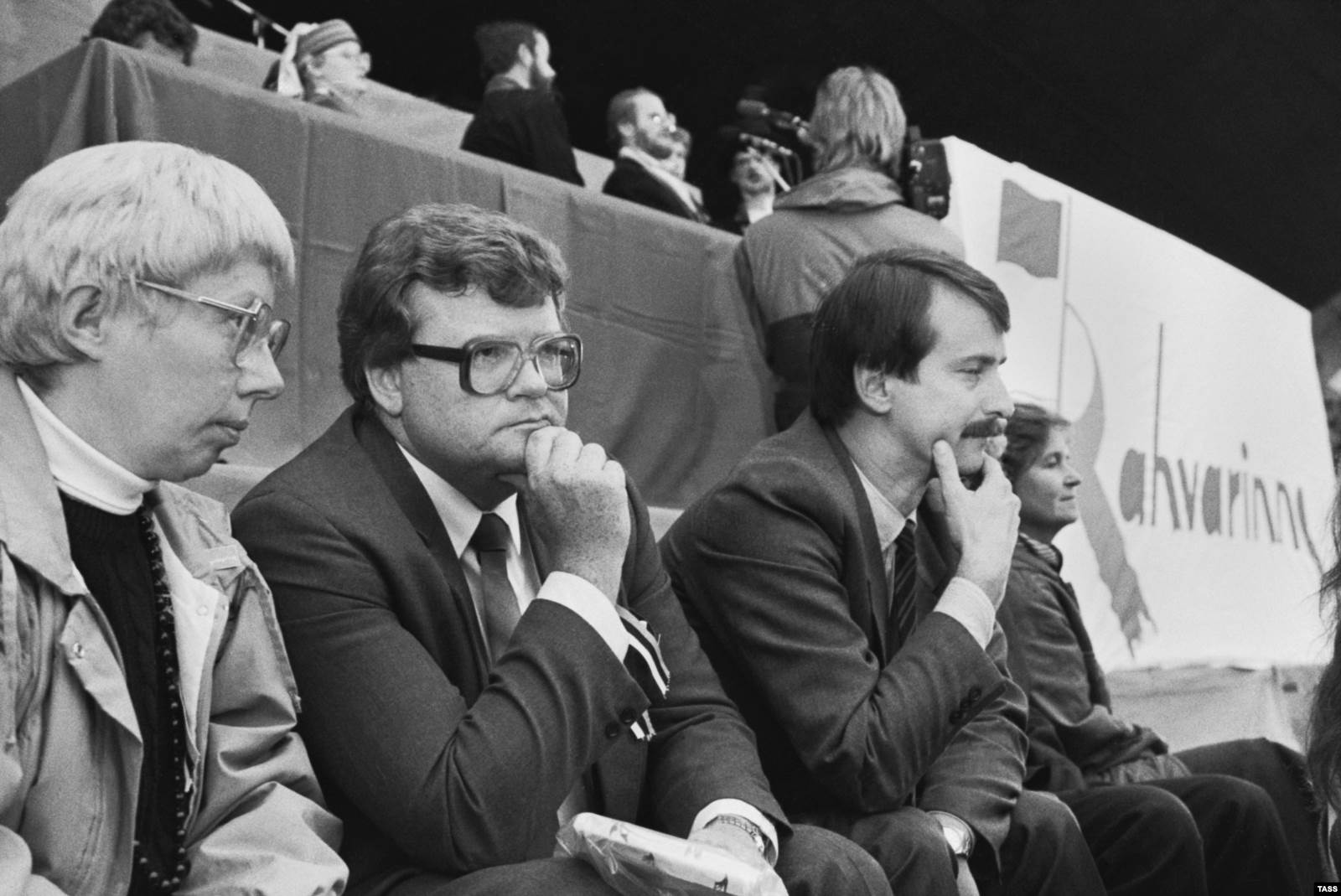 Акция Народного фронта в поддержку перестройки в Таллинне 6 сентября 1988 г. Лидеры Народного фронта: заведующая кафедрой факультета журналистики Тартуского госуниверситета Марью Лауристин (слева) и кандидат философских наук Эдгар Сависаар (по центру)